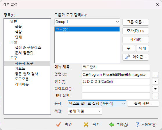 에디트플러스에는 소스 코드를 자동으로 정렬 해주는 기능이 없기 때문에 편의상 기능을 추가해줘야 한다. htmlarg 라는 파일을 다운로드한 뒤 원하는 인수를 넣어주면 된다.